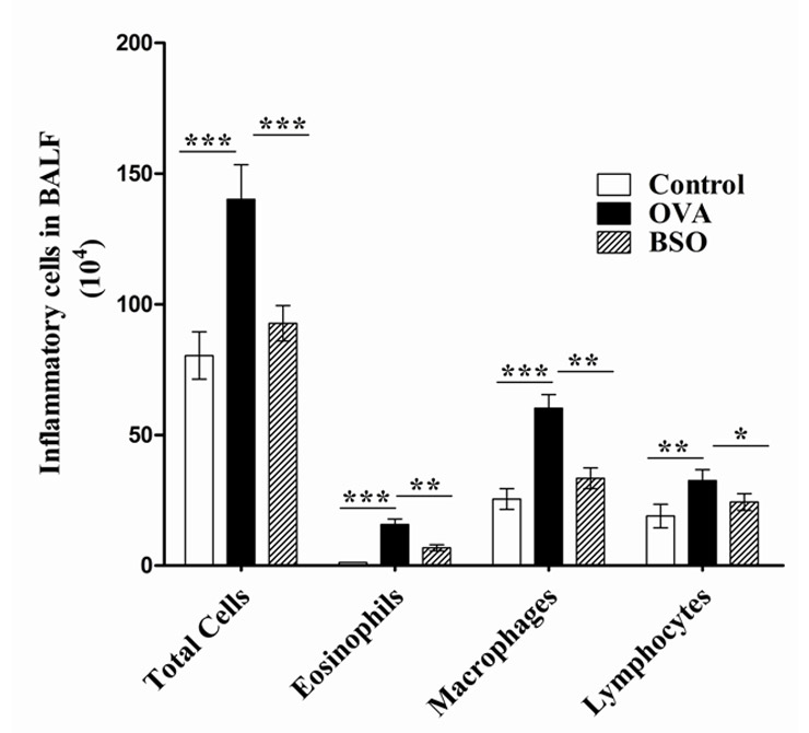 BSO inhibited the recruitment of inflammatory cells in BAL fluid of E3 rats. Rats were divided into 3 groups; Control (immunised and challenged with PBS), OVA (immunised and challenged with OVA) and BSO (immunised and challenged with PBS, and treated with 4 ml/kg of BSO groups). The results were expressed as the means ± S.E.M. for 10 rats in each group. *p <0.05 and **p <0.01, ***p <0.001 were considered statistically significant differences between the control group and OVA group or between the OVA group and BSO group.