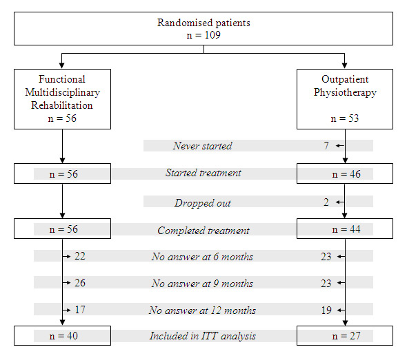 To conclude, the present study underlines the importance of treating all aspects of non-specific low back pain in a multidisciplinary team following cognitive-behavioural principles. Outpatient physiotherapy included active exercises, in accordance with current recommendations, but was insufficient to significantly improve functional and work status. On the other hand, these primary outcomes were significantly improved after and 1 year after functional multidisciplinary rehabilitation. The contrasting literature in this area suggests that further research is still needed. Given the high cost of health care in Switzerland, a cost-effectiveness study is needed to determine whether the benefits of functional multidisciplinary rehabilitation, compared to outpatient physiotherapy, are worth the additional costs.