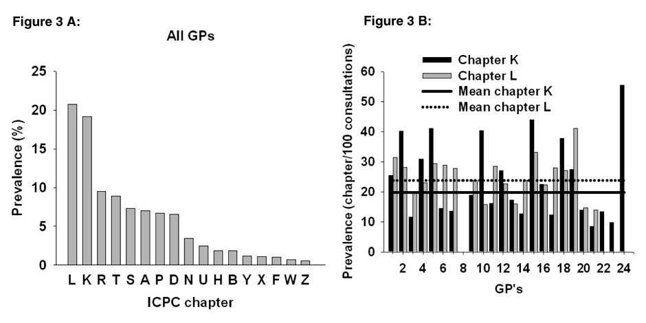 The broad distribution of medical problems according to ICPC-2 chapters is reflected in the wide variability of different diagnoses within the 17 different chapters. Cardiovascular (chapter K) and musculoskeletal (chapter L) were the most prevalent conditions (fig. 3, panel A). To further investigate variability between GPs, we analysed the prevalence of the most common 2 chapters K and L (fig. 3, panel B). The prevalence varied strongly and ranged from 0.01% to 55.5% for chapter K and 0 to 41% for chapter L.