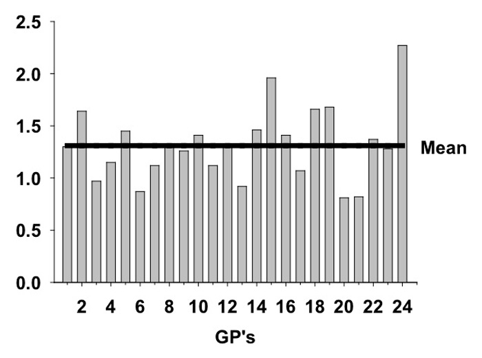 They provided standardised information on 127'922 consultations in 29'398 patients and 159'956 medical problems according to the ICPC-2 classification (table 1). The number of patients covered by each GP ranges from 147 to 2625, numbers of ICPC-codes range from 388 to 15640 and consultations from 270 to 15109. The index of ICPC-codes in relation to the number of consultations varied across participants ranging between 0.55 and 1.78 with a mean of 1.31. The variation in index is moderate with a coefficient of variation of 26.9% (SD 0.35) figure 2. The GP with the fewest patients documented is also the GP with the lowest number of ICPC-Codes and consultations, but does not show the lowest index. During the “hot-coding” week the mean index significantly rose to 1.52 ICPC codes per patient visit (p = 0.01, paired t-test). The mean cholesterol and Hba1c are displayed in table 1 and show a low variabilty for the GPs that measured them (cholesterol: range 4.5–5.7, 95% CI 5.1–5.4, Hba1c: range 5.7–8.3, 95%, 95% CI 6.6–7.1).