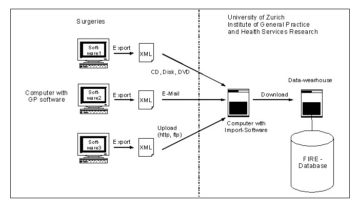 The data transfer structure of FIRE is displayed. Individual EPR data from the GP surgeries are exported using an XML (eXtensible Markup Language) standard, which is independent from any medical software and thus can be processed with the same import software in order to be integrated into the FIRE database. By means of a customised import program, the project manager downloads the XML data periodically, validates for XML-syntax mistakes and feeds the data into the FIRE-database.