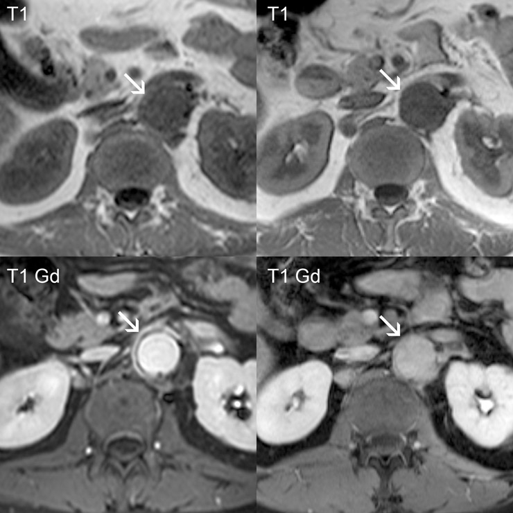 Abdominal magnetic resonance angiography of GCA patient 3 using a 3 Tesla scanner (first exam in the left column, right column after therapy). The inflammatory tissue is depicted as an irregular band with slightly higher signal intensity on non-enhanced T1 weighted images (arrows). After intravenous injection of paramagnetic contrast, this band enhanced conspicuously. After therapy with tocilizumab for three months, the extent of the band decreased and signal intensity after paramagnetic contrast was also considerably lower.