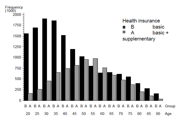 The proportion of the population covered only by basic health insurance increased from 70.4% in 2002 to 73.5% in 2005 (table 1) and the proportion with supplementary insurance was higher for women. There was age-dependent variation in the distribution of the two levels of insurance cover (fig. 1). Below the age of 45 and above 65 more than 50% of the population was covered solely by basic health insurance. Average cover by supplementary insurance was highest between 50 and 60. On average the population with supplementary insurance was considerably older than the population with basic health insurance (table 1).