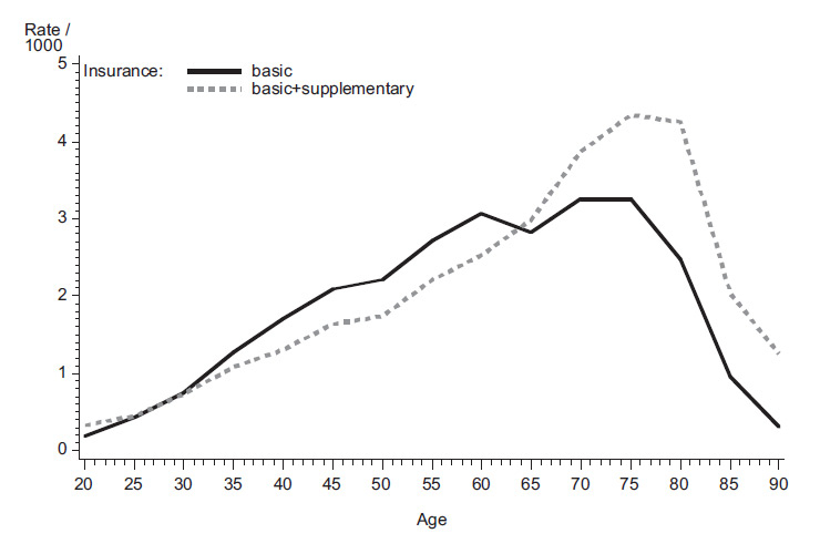Age distribution of populations with basic or with basic plus supplementary health insurance for 2002–2005.