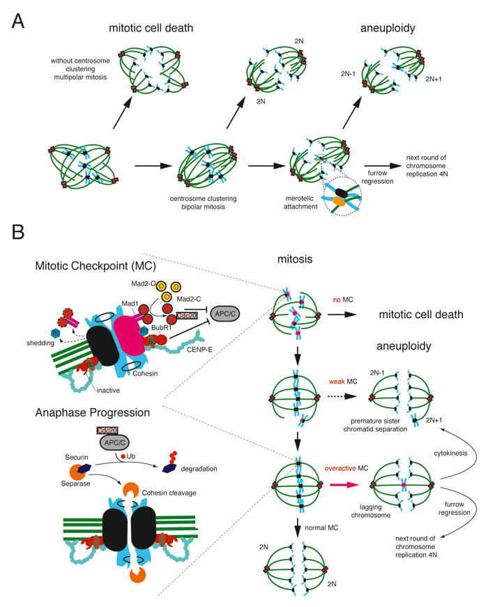 A) Schematic drawing how multiple centrosomes may lead to whole chromosome instability or mitotic cell death. Centrosomes (red), microtubules (green), chromosomes (blue), kinetochores (black), merotelic attached kinetochore (yellow), 2N = diploid chromosome content. B) Schematic drawing of the mitotic checkpoint and the consequences of failure during mitosis. Left, top: zoom of the mitotic checkpoint components on the kinetochore either inactivated with attached microtubules (black) or activated without any attached microtubules (pink). Left, bottom: zoomed view of one kinetochore with correct bipolar attachment of microtubules exemplifying the fulfilment of the mitotic checkpoint when all kinetochores are attached correctly to micortubules and the molecular consequences for progression to anaphase. Right, top – bottom: consequences in mitosis due to an aberrant mitotic checkpoint leading either to mitotic cell death, aneuploidy or furrow regression. Mad1: mitotic-arrest deficient 1, Mad2-C: mitotic-arrest deficient 2 in a closed conformation, Mad2-O: mitotic-arrest deficient 2 in an open conformation, BubR1: budding inhibited by benzimidazole (Bub) R1, CENP-E: centromeric protein E, APC/C: anaphase promoting complex/ cyclosome, Cdc20: cell diviosion cycle 20, Ub: ubiquitin.