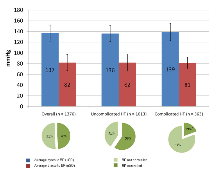 Average systolic and diastolic blood pressure values in the different subgroups of treated hypertensive patients (bar graph). The diagram under the bar graph shows the rate of controlled hypertension according to the individual blood pressure target in the different subgroups. HT: hypertension. BP: blood pressure. SD: standard deviation. * p <0.001, complicated vs uncomplicated hypertension.