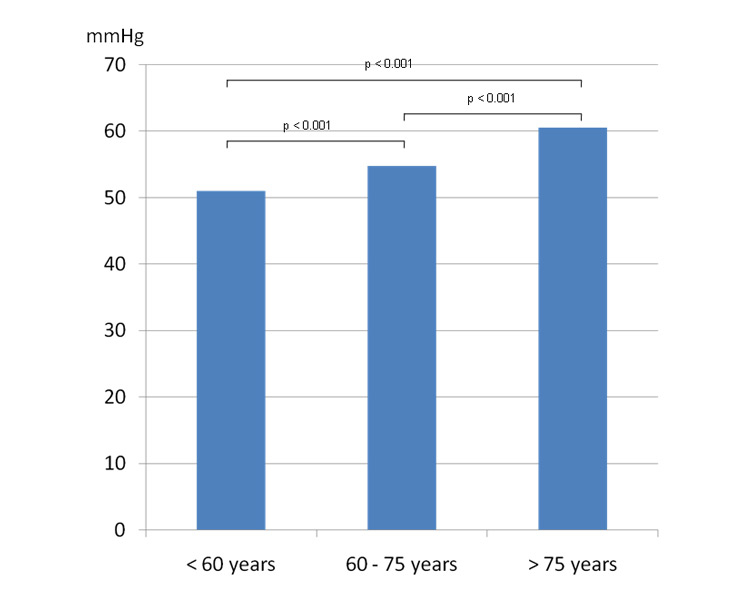 Average BP in patients with complicated hypertension was 138.8 ± 15.6 / 81.0 ± 10.0 mm Hg compared to 136.0 ± 15.3 / 82.1 ± 16.3 mm Hg in patients with uncomplicated hypertension (p = 0.003 for SBP, fig. 1). There were significantly more patients with complicated hypertension in the subgroup with SBP levels ≥160 mm Hg compared to the two other subgroups (34.6% vs. 30.2% vs. 22.9%, p = 0.003). 18.2% of the patients with uncomplicated hypertension had SBP ≥140 mm Hg in combination with DBP <90 mm Hg and 6.3% had SBP ≥150 mm Hg and DBP <90 mm Hg. Women were more likely than men to have isolated systolic hypertension (21.7% vs. 15%, p = 0.006). Patients in the subgroup with SBP between 140 mm Hg and 159 mm Hg were older than patients in the group with SBP <140 mm Hg (66.4 ± 11.6 years vs. 64.3 ± 11.8 years, p = 0.005). By contrast, patients with DBP <90 mm Hg were significantly older than patients with DBP 90–99 mm Hg (66.1 ± 11.8 years vs. 61.7 ± 11.6 years, p <0.001) and patients with DBP ≥100 mm Hg (66.1 ± 11.8 years vs. 60.6 ± 10.4 years, p <0.001). Thus, as expected, there was a significant age-dependent pulse pressure increase (fig. 2). Correspondingly, patients with isolated systolic hypertension were older than patients without this condition (68.7 years vs. 64.5 years, p <0.001).