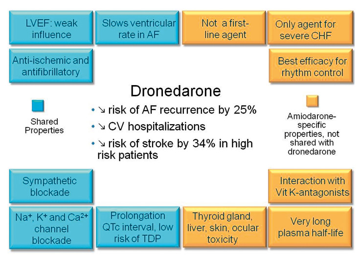 Dronedarone: differences to amiodarone. AF: atrial fibrillation. CHF: congestive heart failure. CV: cardiovascular. LVEF: left ventricular ejection fraction. TDP: torsade de pointes tachycardia.