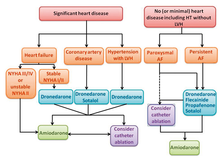 Rhythm control strategy (whenever rate control unsatisfactory). Choice of antiarrhythmic drug and ablation according to underlying pathology. Adapted from [18]. AF: atrial fibrillation; HT: hypertension; LVH: left ventricular hypertrophy; NYHA: New York Heart Association.