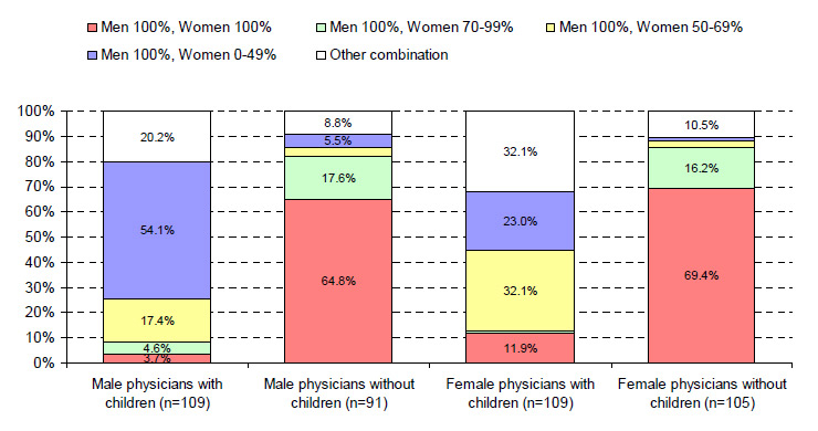 The most prevalent arrangement in terms of the employment status of male physicians with children was that they worked full-time, and their partners were unemployed or worked less than 50% time (fig. 1), while the most common arrangement for male physicians without children was that both partners worked full-time. For female physicians with children, the most frequent arrangement was that they worked 50–69% and their partners worked full-time, while the most common arrangement for female physicians without children was that of both partners working full-time.