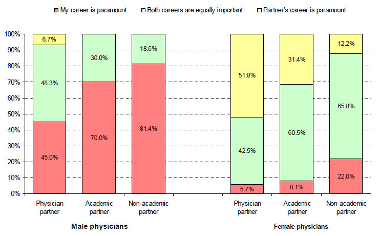 The three types of couples differed in terms of assessment of career priority, however (fig. 2). Male physicians with a physician partner most frequently considered both careers to be of equal importance, while male physicians with an academic partner or non-academic partner most frequently considered their own career to be paramount (p ≤0.001). Female physicians with a physician partner most frequently considered their partners’ careers to be of prime importance, while female physicians with an academic or non-academic partner most frequently considered both careers to be of equal importance (p ≤0.001).