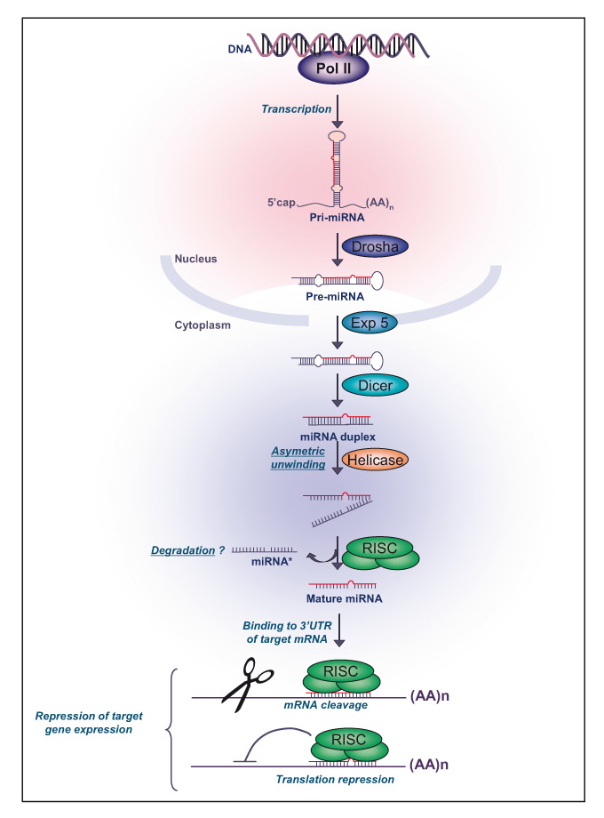 Following cleavage by Dicer, the miRNA pathway is biochemically very similar to the RNA interference (RNAi) known as an RNA silencing pathway widespread from plants to animals. The actions of the miRNA guide strand are mediated by the catalytic component of the ribonucleoprotein (miRNP) RISC complex formed by a member of the Argonaute family (Ago) and a number of unknown accessory factors. RISC acts to downregulate the translation of target mRNA by mechanisms of either mRNA cleavage or translational repression, depending on the perfect or incomplete complementary between the miRNA guide strand and its mRNA target. It is believed that most of the miRNAs typically mediate translational repression rather than mRNA cleavage. Among the Ago family proteins, only Ago2 is able to cleave the target by endonuclease activity [18]. All other Ago proteins mediate translational repression by imperfect complementary between the miRNA guide strand and the target mRNAs. In that case the expression of targeted genes is evidenced at the protein level without decreased mRNA levels. Alternatively, repressed mRNAs are relocated for storage into specific intracellular organelles called P-bodies, where miRNAs and associated proteins are co-localised [19].