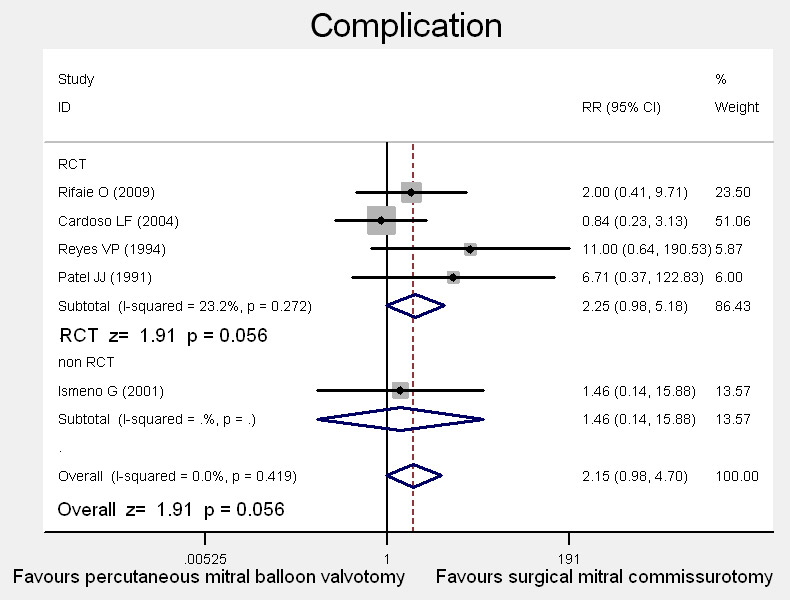 Besides operative mortality and mitral insufficiency, a variety of significant clinical complexities may be encountered such as haemopericardium, low-output state, intractable arrhythmia, cerebrovascular accident or excessive bleeding and so on. Data from studies that compared the percutaneous balloon intervention and thoracotomy surgery with regard to significant operative complications were available in five articles. Pooling the results yielded a non significant difference between the percutaneous balloon intervention and thoracotomy surgery group with a relative risk of 2.15, 95% confidence interval of 0.98–4.70, and p = 0.056. There was no statistical heterogeneity (fig. 4). The stratification for RCT and case-control trial did not affect the results.