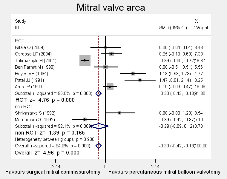 Forest plot showing the results from the meta-analysis of trials reporting mitral valve area and comparing surgical and percutaneous balloon commissurotomy.