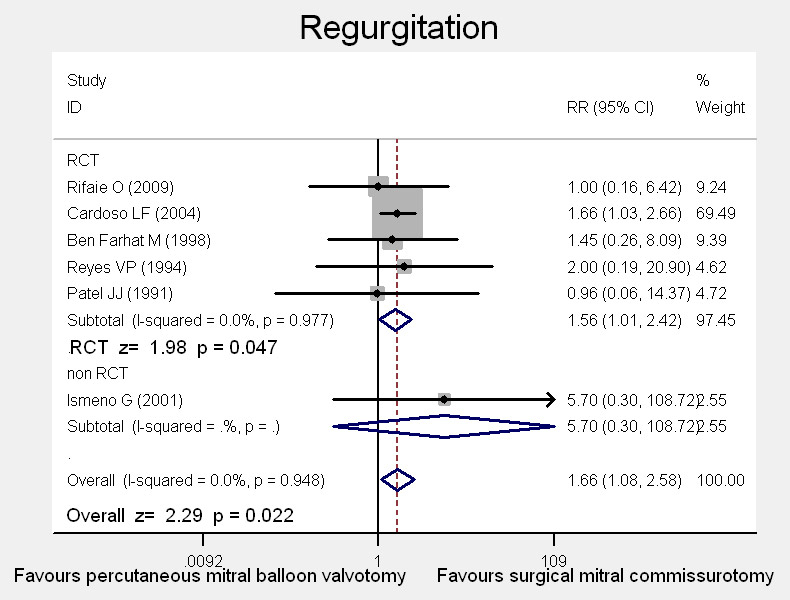 Mitral regurgitation caused by intervention was defined as new-onset or enhanced original insufficiency equal to or greater than grade 1 during the follow-up period. Six clinical trials, focusing on the mitral regurgitation related to intervention, demonstrated that there was a significantly higher occurrence of mitral regurgitation in patients with percutaneous balloon intervention relative to thoracotomy surgery. Fixed effect (Mantel-Haenszel) pooled relative risk was 1.66 (95%CI 1.08–2.58, p = 0.022). No heterogeneity was detectable (p = 0.948). Only by pooling the outcomes of RCT, did we also get the identical result in favour of surgery group (RR = 1.56, 95% CI 1.01–2.42). See fig. 3.
