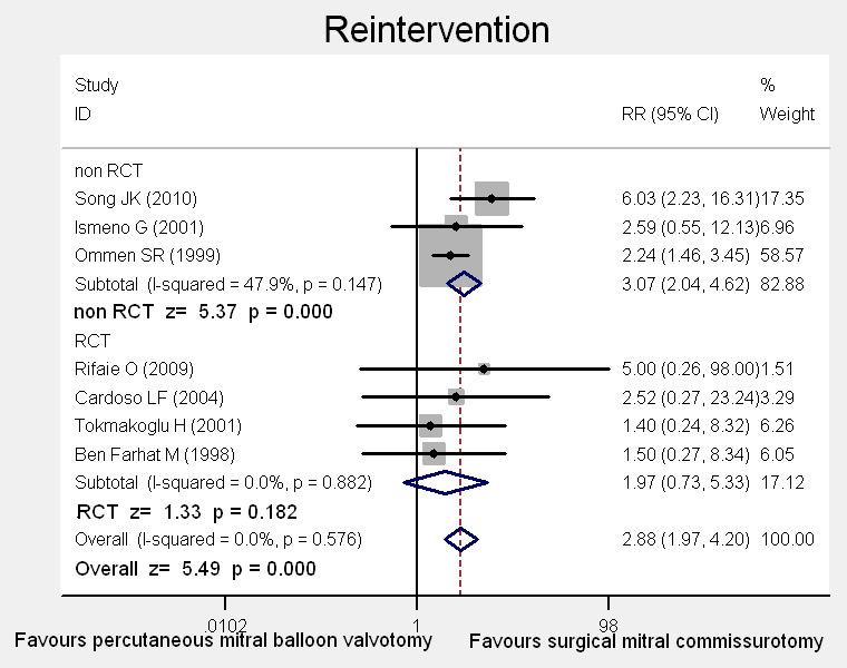 Of the twelve studies, seven provided data on re-intervention including re-operation and repeated percutaneous balloon intervention for significant mitral valves dysfunction, with the outcome assessment time varying from one year to seven years. The pooling analysis obtained a higher relative risk of re-intervention in percutaneous balloon intervention compared to the thoracotomy surgery group of 2.88 (95% confidence interval 1.97–4.20; p <0.01), with no evidence to suggest statistical heterogeneity (p = 0.576). The variation in relative risk attributable to heterogeneity (I2) was 0 (see fig. 2). Although in the RCT stratification, there seemed comparable relative risks in re-intervention between groups, the small size sample limited the strength of RCT. Hence, by pooling these small size sample studies, the effective sample size is greatly increased in the meta analysis, and consequently more reliable outcomes can be obtained.