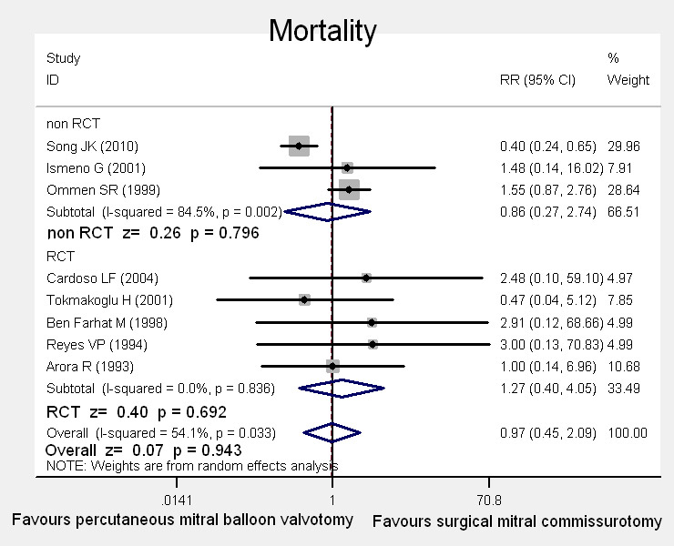 Forest plot showing the results from the meta-analysis of trials reporting all cause mortality after mitral valvulotomy using surgical and percutaneous balloon commissurotomy.