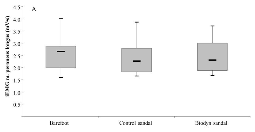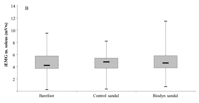 Box plots comparing muscle activity (iEMG) between testing conditions, of the m. peroneus longus during the swing phase (5A) and the m. soleus during the stance phase (5B) of a regular walk at preferred gait speed.