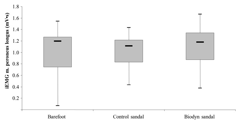 Box plots comparing muscle activity (iEMG) between testing conditions, of the m. peroneus longus obtained during bipedal stance.