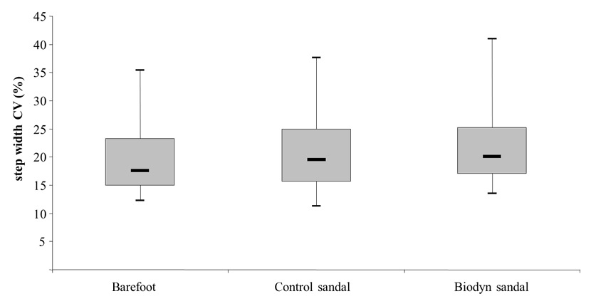 Figure 4 indicates that step width coefficient of variation (CV) was significantly greater for the Biodyn sandal compared to the barefoot condition (Z = –2.58; p = .005). The respective median values (95% CI) amounted to 20.00 (18.55–24.10) % for the Biodyn sandal and 17.52 (16.99–22.91) % for the barefoot condition. Comparison of step width CV between the Biodyn sandal and the control sandal, 19.46 (17.63–23.70) %, revealed no statistically significant difference (Z = –1.55; p = .121) (table 2). No significant differences between test conditions were observed for the parameters of stride time/length CV.