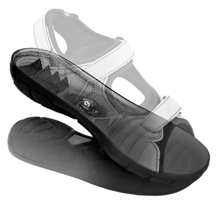 The unstable shoe condition tested in this study was the Biodyn sandal (model no. 4500) from Biodyn Human Footwear Technology, Germany (mass: 278 g). The tested sandal was characterised by a two-part-function sole, which was regularly shaped and not rounded. The first part consists of a soft element (polyurethane foam) that is integrated into the rear part (heel) of the shoe sole. The second part represents a freely moving pivot point (thermoplastic polyurethane; diameter 122 mm) underneath the arch of the foot, enabling three-dimensional movement of the foot while walking (fig. 1). Due to the regularly shaped sole, prior instruction sessions are not necessary before wearing these sandals. The tested control sandal (mass: 245 g) was a standard commercially available sandal that came with a similar hook-and-pile fastener technique as the Biodyn sandal.