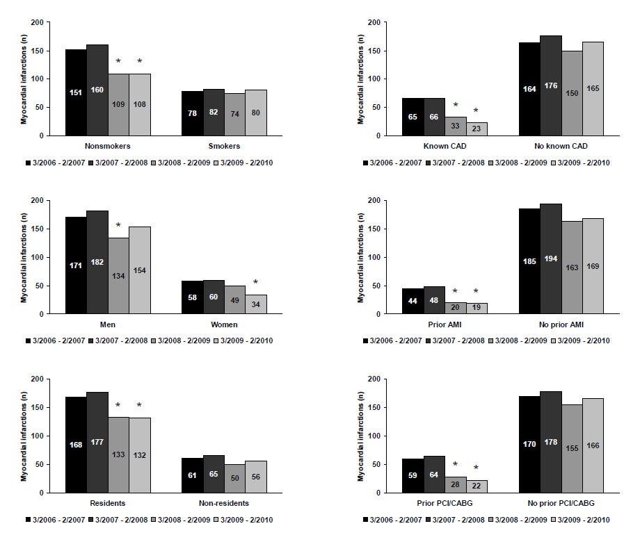 Numbers of myocardial infarctions in various subpopulations in Graubünden in the two 12-month periods before (3/2006 – 2/2007 and 3/2007 – 2/2008) and the two 12-month periods after (3/2008 – 2/2009 and 3/2009 – 2/2010) implementation of a public smoking ban. * P<0.05 vs. each of the two 12-month periods preceding the ban. CAD, coronary artery disease; AMI, acute myocardial infarction; PCI, percutaneous coronary intervention; CABG, coronary artery bypass graft surgery.