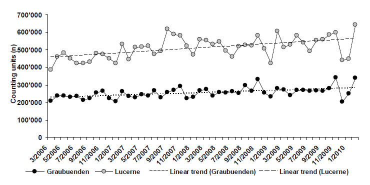 Numbers of lipid-lowering drugs (counting units; tablets) sold in Graubünden and Lucerne from March 2006 to February 2010. The dashed lines show the overall trends in sales figures for the respective region over time. (Data are courtesy of IMS Health GmbH, Switzerland)