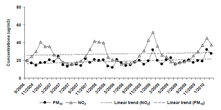 Average monthly outdoor concentrations of PM10 and NO2 in Graubünden from September 2006 to February 2010. The dashed lines show the overall trends in the concentrations of the respective parameter over time.