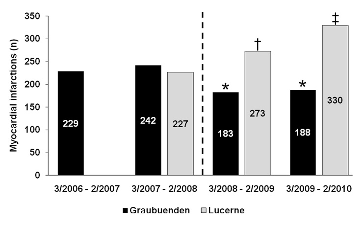 Numbers of myocardial infarctions in Graubünden (black bars) and Lucerne (grey bars) in the year(s) before and the years after implementation of a public smoking ban in Graubünden (dashed line). Note that no data were available for Lucerne for the first 12-month period because not all public hospitals in Lucerne participated in the AMIS Plus registry at that time. * P<0.05 vs. each of the 2 previous 12-month periods in Graubünden. † P<0.05 vs. the previous 12-month period in Lucerne. ‡ P<0.05 vs. each of the 2 previous 12-month periods in Lucerne.