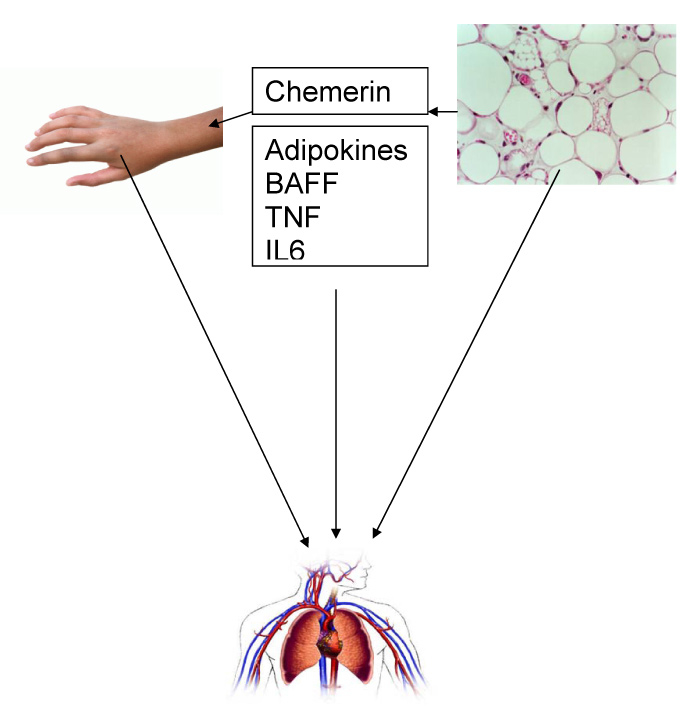 Biological data have certainly clarified that adipose tissue is a dynamic endocrine organ that releases several bioactive substances, in common with inflammatory diseases such as RA, including some pro-inflammatory cytokines like TNF-α and IL-6, and specific cytokines, termed adypokines. These include adiponectin, leptin, resistin and visfatin, some of which promote inflammatory responses and metabolic dysfunction, and others which contribute to the resolution of inflammation and have beneficial effects on obesity-linked metabolic disorders [54]. One adipokine which gained upmost importance just recently has been chemerin, which plays a critical role in adipogenesis. Through its receptor ChemR23 it can amplify inflammation and lead to cartilage damage. In obese people it has been shown that adipose tissue presents more inflammatory infiltrate than normal-weight people and is characterised by different regulatory mechanisms and cytokine pattern production [55]. This implies that pro-inflammatory cytokines and adipokines can affect metabolic dysfunction and CV risk on the one hand, and rheumatoid arthritis on the other one. In this regard, an Italian retrospective study first described an approximately 3–fold lower chance to achieve remission in RA, obese patients receiving anti-TNF therapy than in normal-weight RA patients [56]. These data were confirmed by a recent prospective study showing that a high body mass index (BMI) was associated with a poor response to infliximab [57], a drug whose dose should still be proportional to body weight, supporting the fact that adipose tissue may be involved in the pathophysiology of RA. If we consider that obese patients are at increased risk of developing RA, with an adjusted odds ratio of 3.74 [58], then we may conclude that an obese RA patient does have more inflammation than the same RA in a non-obese patient.