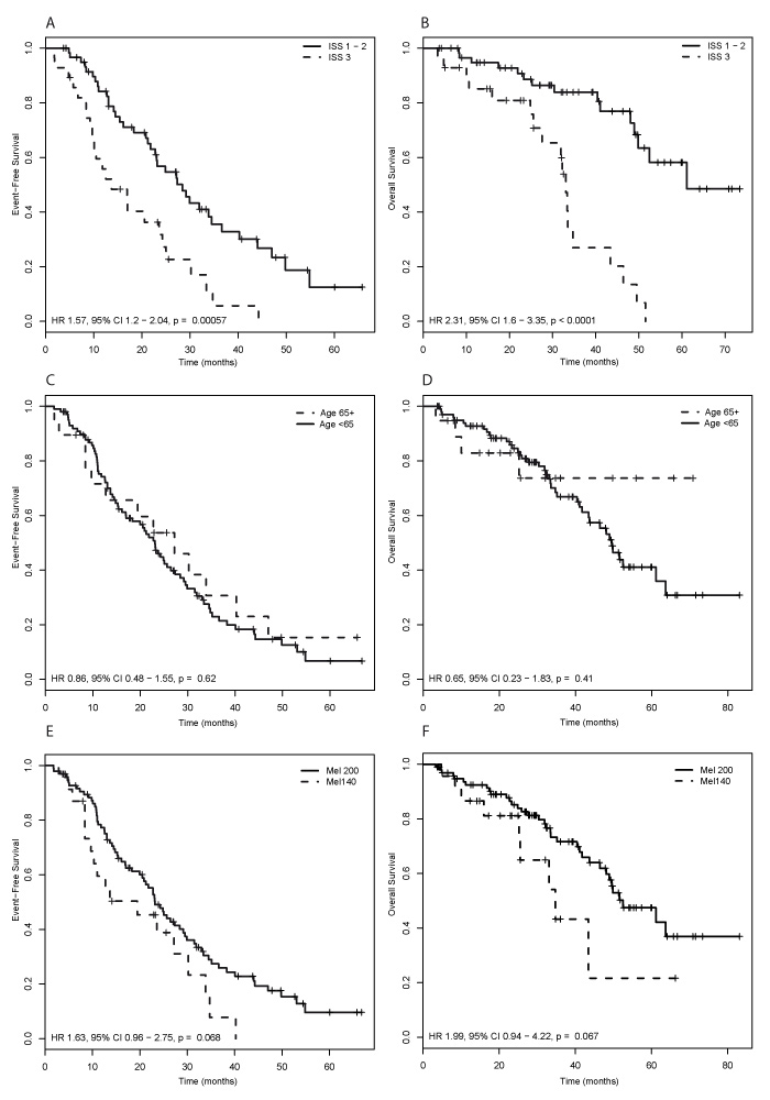 Impact of ISS myeloma stage (A, B), patient age (C, D), and melphalan dose (E, F) on patients’ outcome. (A, C, E) Event free survival, and (B, D, F) Overall survival. ISS, international staging system; Mel, melphalan.