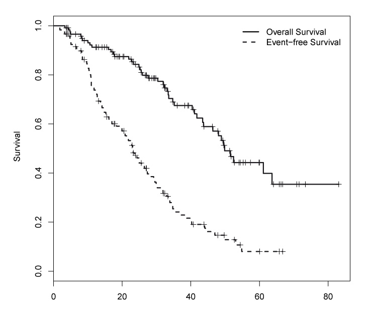 Event free survival (EFS) was defined as time from ASCT to the time of first recurrence after achievement of CR or nCR, to the time of progression in non-CR patients, as verified by serological assessment, bone marrow biopsy or imaging, or to the time of death by any cause. Overall survival (OS) was defined as time from ASCT to the time of death by any cause, as documented in the patient charts.