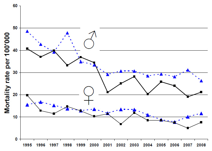 Age-standardised mortality rate (per 100'000 inhabitants) for myocardial infarction in the Cantons of Lucerne (triangles; dashed line) and Graubünden (squares; solid lines), 1995–2008, for men and women. Age standard: WHO world population. Mortality data: from death statistics of the Swiss Federal Statistical Office (FSO). Standardisation and graph: by Verena Jürgens, Swiss TPH Basel.