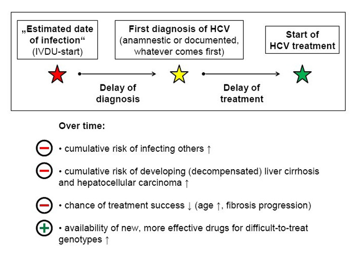 HCV-negative patients at risk should be screened in regular intervals [2] to diagnose HCV earlier and treatment should be offered as soon as possible after diagnosis to prevent a delay of treatment. The latter accounts for an increasing risk of developing liver cirrhosis and HCC, and a reducing chance of treatment response over time (already established fibrosis, age >40 years) as well as for an uninterrupted transmission chain (fig. 1), which constitutes a socio-economic problem.