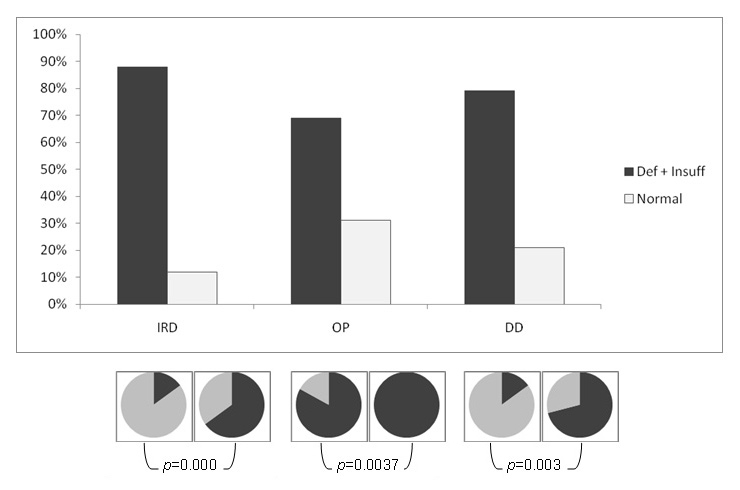Underlying pathologies: effects of vitamin D3 supplementation. Circles : black : daily vitamin D3, grey : no supplementation Def + Insuff: Deficiency + Insufficiency, IRD: Inflammatory Rheumatic Disease, OP: Osteoporosis, DD: Degenerative Disease
