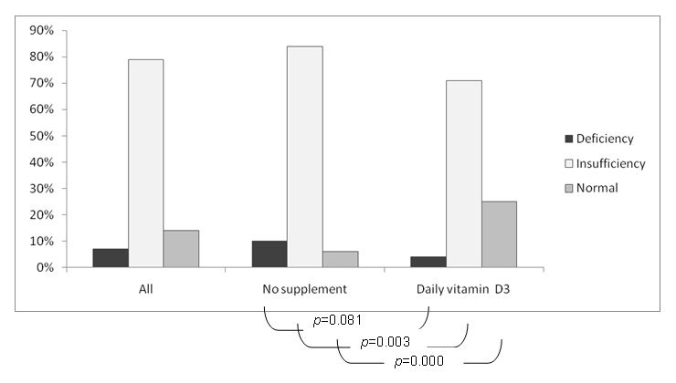 Supplementation did somewhat improve the figures, with a significantly higher prevalence of normal results and a lower prevalence of insufficiency (p <0.05). The difference of prevalence of vitamin D deficiency did not reach statistical significance (p = 0.081), probably due to the small number of patients in this category.
