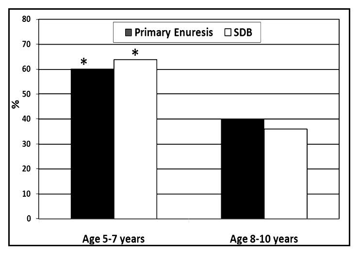 The incidence of primary nocturnal enuresis and SDB in relation to age. (*indicates p <0.05).
