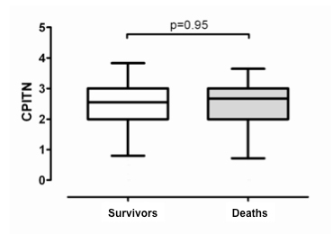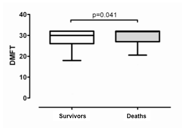 DMFT (fig. 1A), SLI (fig. 1B), and CPITN (fig. 1C) indices in patients who died (n = 107) compared to survivors (n = 304). Box bottom marks the 25th percentile, the line within marks the median, and the box top marks the 75th percentile; the bottom and top of the vertical lines mark the 5th and 95th percentiles respectively.