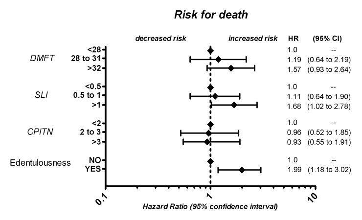 Adjusted risk for overall mortality according to tertiles of DMFT, SLI, CPITN and edentulousness respectively.