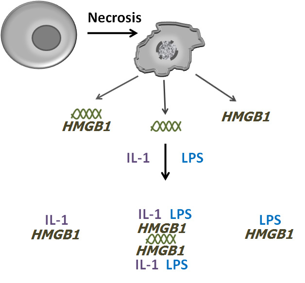 In this model, the binding of LPS is neither an artefact nor an experimental nuisance. Rather, it may be a key mechanism to accelerate events in innate immunity. During serious infection, time is of the essence to activate defensive measures. Thus, by binding circulating LPS or DNA, the immunological activity of the developing complex can rapidly increase, with the presence of the PAMP, even if in a low concentration, integral to the boost in immune potential. These complexes can be called DAMP-PAMP complexes. In addition to picking up circulating PAMPs to construct a DAMP-PAMP complex, HMGB1 can incorporate cytokines which, in initial stages of any response, are likely present in low concentration. With a complex decorated by PAMPs and cytokines, simultaneous interaction with a variety of receptor types can occur, acting synergistically to boost or amplify signals that would be much less powerful if delivered individually. Figure 2 illustrates this model.