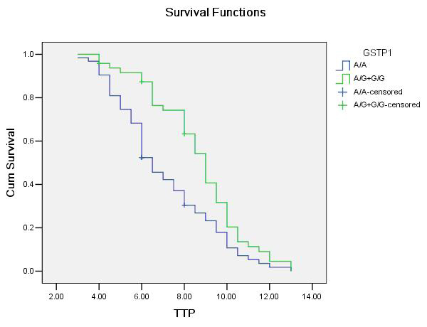 Association between GSTP1A313G genotypes (A/G and G/G as a combined group) and time to progression (TTP) in patients with advanced NSCLC receiving platinum-based chemotherapy. The vertical hash marks denote the time of last follow up for those patients lost to follow …up.