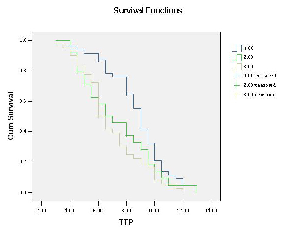 The median TTP of patients in group 1, group 2, group 3 were 9.000 (8.475 to 9.525) months, 6.500 (4.580 to 8.420) months and 6.000 (5.497 to 6.503) months respectively. The difference was significant (log-rank test, P = 0.007; table 5; fig. 3). In the Cox proportional hazards model, after adjusting for age, gender, tumour histology, tumour differentiation and chemotherapy regimens as an indicator variable, we found that the combination of GSTP1A313G and XRCC1G28152A polymorphisms was independently associated with TTP of the patients (P = 0.012), and the hazard ratio (HR) was significantly higher for individuals in group 3 (HR, 2.084; 95%CI, 1.282–3.390; P = 0.003) compared with patients in group 1.