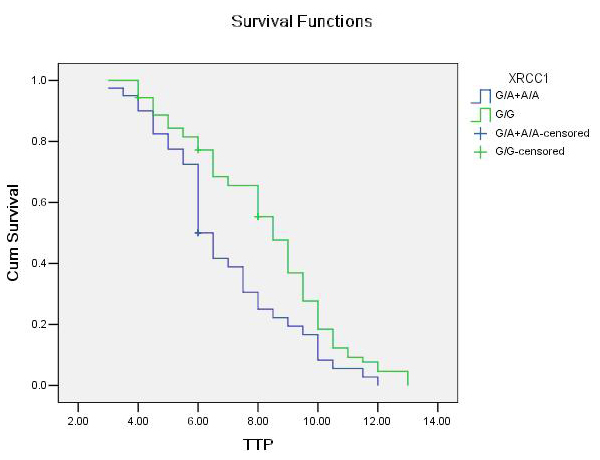 Association between XRCC1G28152A genotypes (G/A and A/A as a combined group) and time to progression (TTP) in patients with advanced NSCLC receiving platinum- based chemotherapy. The vertical hash marks denote the time of last follow up for those patients lost to follow up.