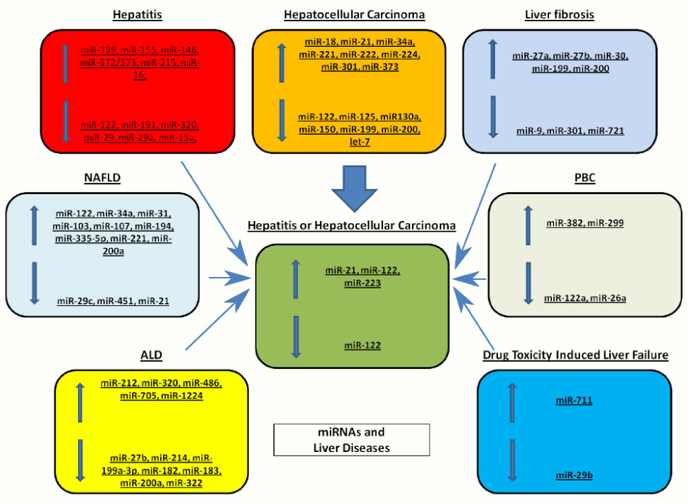 Schematic representation of miRNA expression and its deregulation in various liver diseases. This includes hepatitis, hepatocellular carcinoma (HCC), liver fibrosis, nonalcoholic fatty liver disease (NAFLD), hepatitis and HCC, primary bilary cirhossis (PBC), alcoholic liver disease (ALD), and drug toxicity induced liver injury. Arrows pointing upwards indicate upregulation. Arrows pointing downwards indicate downregulation.