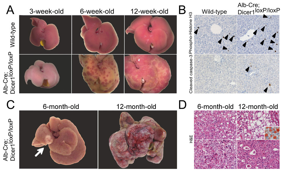 Disruption of Dicer1 induces dysregulated foetal gene expression and promotes hepatocarcinogenesis. (A) Macroscopy of wild-type and Albumin-Cre;Dicer1loxP/loxP livers at various time points postnatal (p.n.). At 3 weeks p.n. Albumin-Cre;Dicer1loxP/loxP mouse livers appeared pale when compared to wild-type livers. At 6 weeks, the Albumin-Cre;Dicer1loxP/loxP liver have developed a yellow colour with red areas. The normal-coloured areas had expanded at 12 weeks. (B) Immunohistochemical analysis for phospho-histone H3 and cleaved Caspase-3 in 3-week-old murine livers of Albumin-Cre;Dicer1loxP/loxP and wild-type mice. (C) HCC in Albumin-Cre;Dicer1loxP/loxP mice at as early as 6 and 12 months p.n.. One HCC nodule observed in a 6-month-old Albumin-Cre;Dicer1loxP/loxP liver (left panel, white arrow). At 12 months of age Albumin-Cre;Dicer1loxP/loxP livers carry multiple HCC (right). (D) On histological level HCC displayed mild steatosis, top, left), prominent steatosis (top, right), as indicated by oil red O staining (inset), poorly differentiated tumour cells with a solid growth pattern (bottom, left), and a pseudoglandular pattern (bottom, right). The figure was adapted from [83].