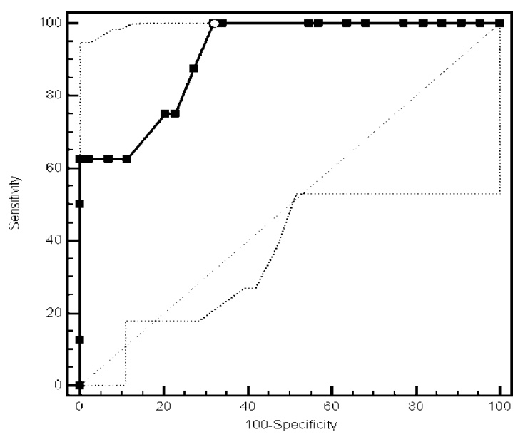 Receiver operating characteristic (ROC) curve for prediction of early hypoparathyroidism using intraoperative rapid PTH assay. Area under the curve (AUC) = 0.912 (SE = 0.05, 95% CI = 0.8 – 0.973, P < 0.0001). White dot along the curve represents optimal cutoff value (PTH < 27 pg/ml). This had sensitivity of 100% (95% CI = 63.1% – 100%), specificity of 68.2% (95% CI = 52.4% – 81.4%, LR+ of 3.1 (95% CI = 2.6 – 3.8), LR– of 0, PPV of 36.4% (95% CI = 17.2% – 59.3%), and NPV of 100.0% (95% CI = 88.1% – 100%).