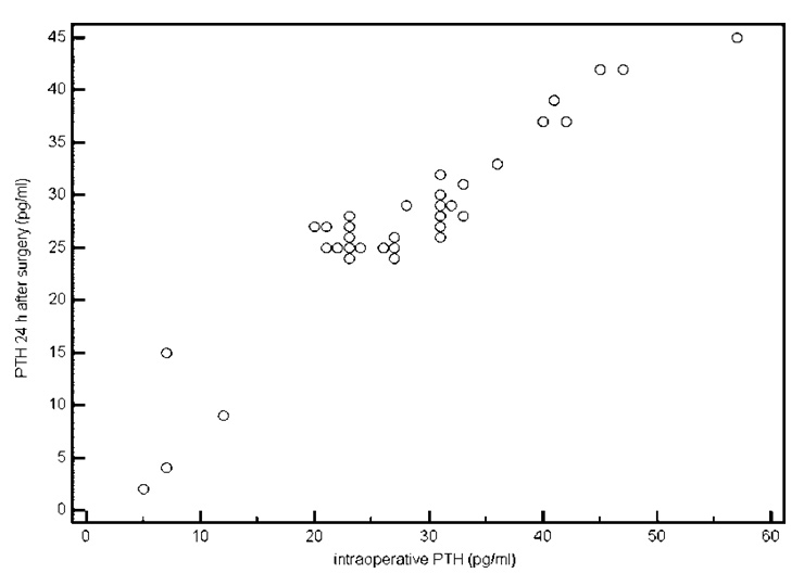 Sixteen of the 52 patients (30.7%) had reduction of their intraoperative PTH levels below 25 pg/ml; 11 patients had ranges of PTH between 15–25 pg/ml, and 5 had levels below 15 pg/ml. There was a strong correlation between intraoperative rapid PTH assays and standard PTH assays taken 24 hours after surgery (correlation coefficient = 0.95, P <0.001) (fig. 1).