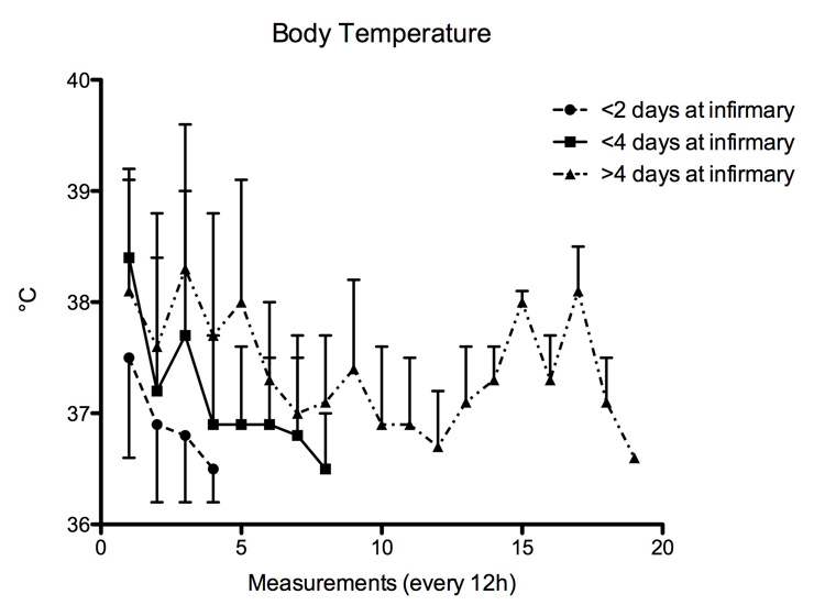 Body temperature of patients according to their length of stay at infirmary.