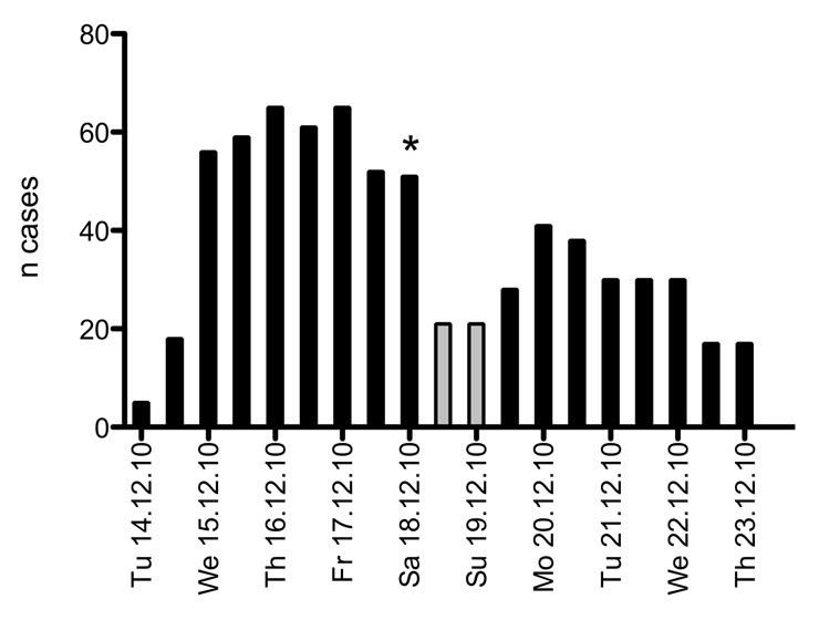 Epidemic curve, representing all cases at infirmary every 12 hours. The 32 patients, who stayed at home after the weekend break, were not included because the exact day of disease onset was not known. The gray bars indicate a 36 hour weekend-leave for healthy recruits. * = hospitalisation of two recruits.