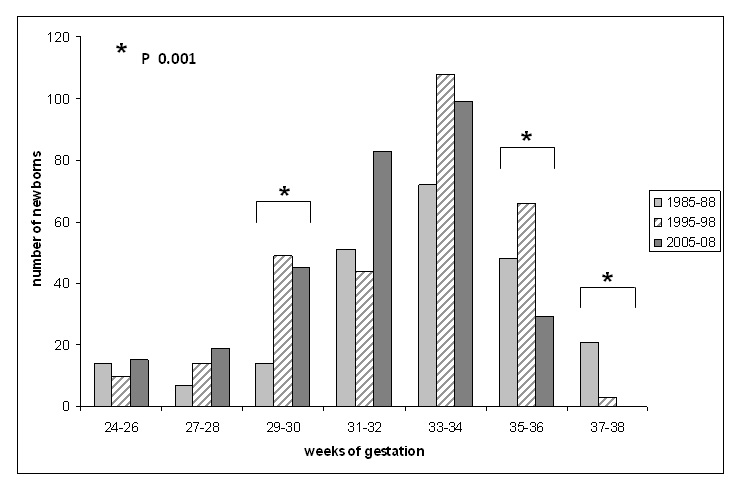 One of the most promising changes over the last two decades is the increasing centralisation, which improved from 56% twenty years ago to 94% at present. This is clearly in accordance with the guidelines of the Swiss Society of Neonatology [25]. Few infants required postnatal transfer, and all but one did so because of capacity problems in the primary NICU, an ongoing problem in Switzerland. This pinpoints the logistical problems encountered by the sudden arrival of three, four or five small premature infants. Figure 1 shows the breakdown of live born triplets according to their GA in the three surveys. Comparison between the first and the third studies demonstrates a shift towards more premature infants.